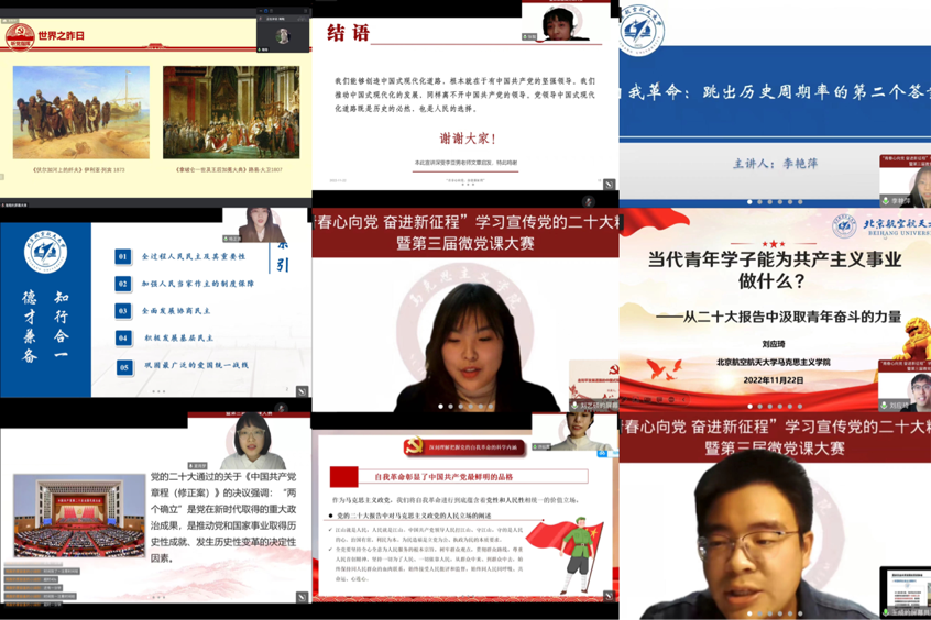 beat365中文官方网站2022级硕士研究生海翔、张智、李艳萍、杨正清、刘艺硕、刘应琦、夏雨梦、许纭露、王成,分别以“以人民为中心的发展思想”“中国式现代化的根本保证”“党的自我革命”“实现全过程人民民主”“走和平发展道路的中国式现代化”“从二十大报告中汲取青年奋斗的力量”等为主题,对二十大报告精神进行了宣讲。