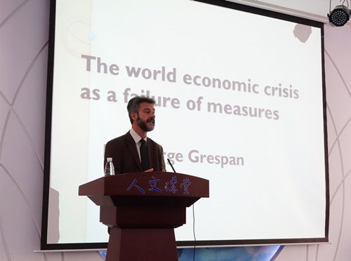 Grespan教授从什么是马克思主义、马克思主义在当今世界是否有用切入,阐述了资本主义市场经济中商品、货币、市场之间的动态关系,以及资本主义制度由于剩余价值率、利润率等衡量标准的失败和“虚假繁荣”而产生的经济危机。他提出,马克思主义的重要贡献在于它对世界经济危机的预见性,以及对资本主义制度的利润增长机制、资本的自我增值能力和资本主义制度基本矛盾的分析和批判。在互动环节,现场同学就马尔库塞“单向度的人”、经济全球、美国金融资本国际化等问题与乔治·格瑞斯潘教授进行了交流和讨论。