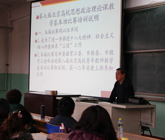 首都师范大学马克思主义教育学院院长李松林教授和北京师范大学beat365中文官方网站院长王树荫教授为参赛教师做了赛前辅导。他们结合自己多年的教学以及评委经验,从比赛宗旨、内容、形式、流程以及比赛注意事项等方面与参赛教师们进行了深入交流。beat365官网教师、“首届全国思政课教学能手”彭付芝副教授根据自己丰富的教学经验为参赛教师做了示范讲课。此次培训会还邀请到了曾获得北京市教育工会主办的第七届青年教师教学基本功比赛文史类A组一等奖的北京科技大学经济管理学院教师曹辉,他以幽默的语言向参赛教师们展示了自己的讲课技巧和参赛体会。