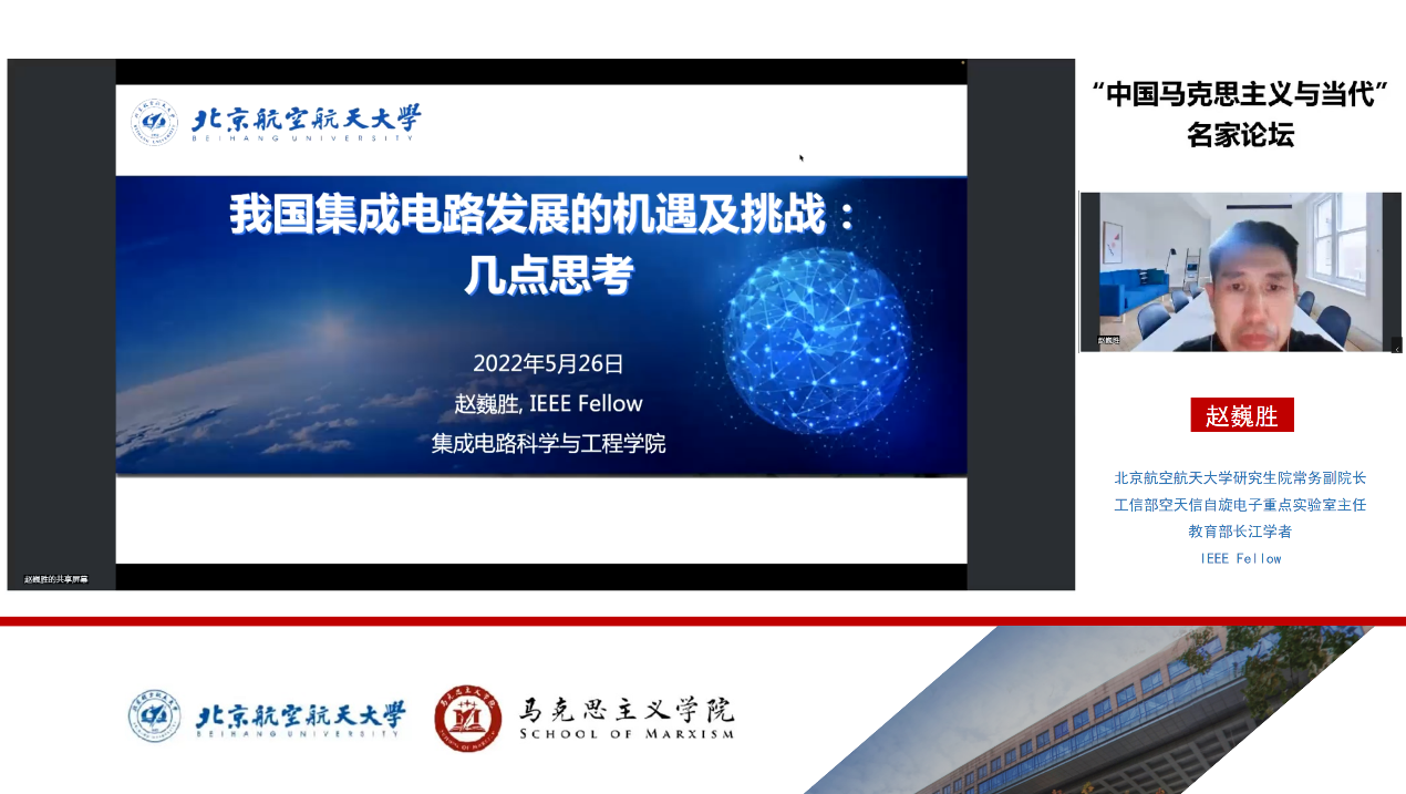 2022年5月26日下午,beat365官网博士生思政课“中国马克思主义与当代”邀请2021年“科学探索奖”获奖人、beat365官网研究生院常务副院长、工信部空天信自旋电子重点实验室主任赵巍胜教授做客“名家讲坛”,讲授“我国集成电路发展的机遇及挑战:几点思考”专题报告。beat365官网2021级博士生在线聆听报告,beat365中文官方网站部分教师旁听报告。报告由beat365官网beat365中文官方网站副院长王娜主持。