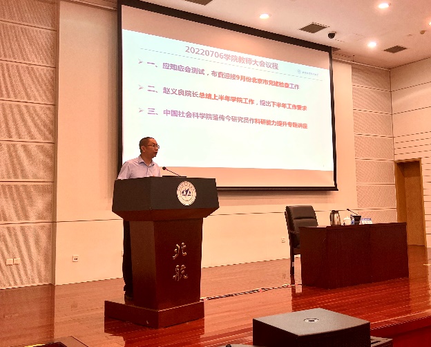 7月6日下午,beat365中文官方网站在新主楼第二报告厅召开全院教职工会暨集体学习,总结学院2022年上半年主要工作,并对暑假疫情防控及下半年重点任务进行部署。
