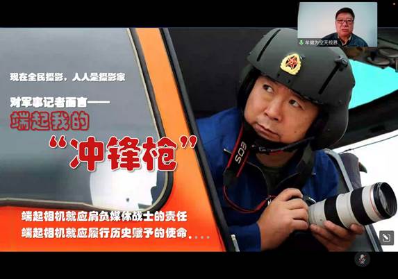 牟健为老师强调,对于军事记者而言,端起相机就应肩负媒体战士的责任,就应履行历史赋予的使命。他首先展示了自己曾经的获奖作品,如《申奥成功之夜的天安门广场》、《老红军跪谢医疗队》……讲述每张照片背后的故事,深入浅出,引人入胜,强调摄影师应当是社会道义的担当者,是客观事实的传播者,是真善美的颂扬者,通过一张张社会反响强烈、深受人民喜爱的作品,在全社会唱响了主旋律,弘扬了正能量,为社会主义精神文明建设贡献自己的力量。