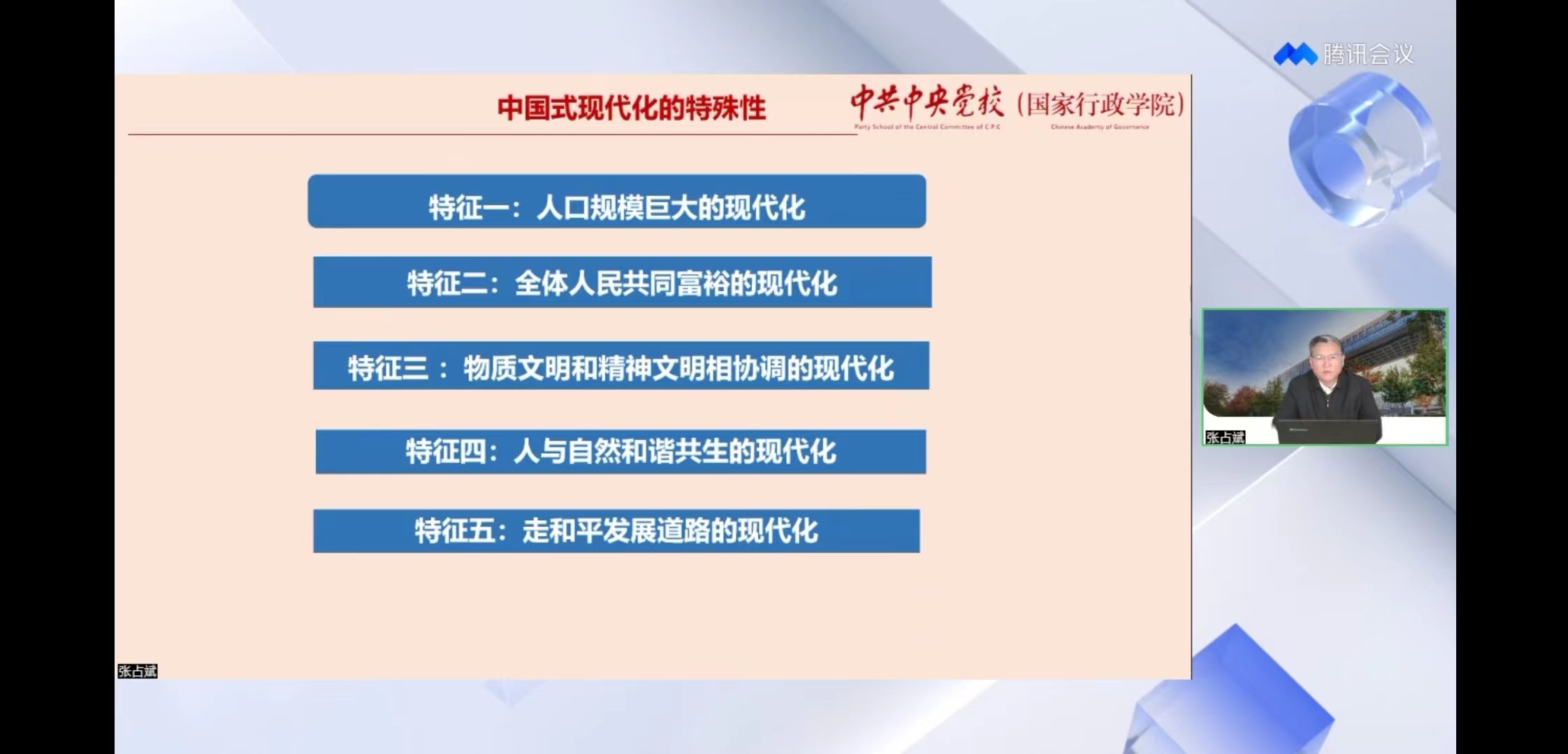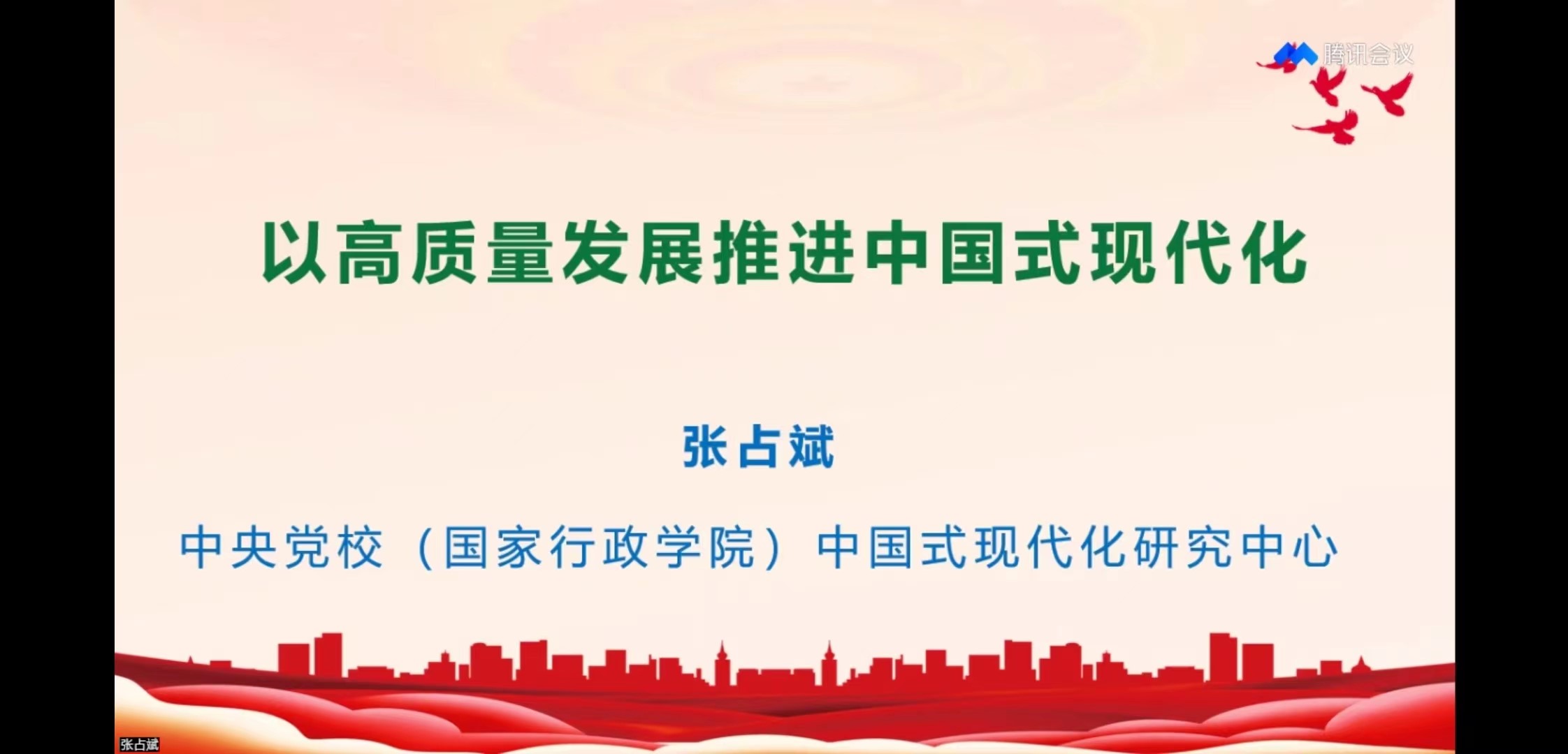 2023年12月20日上午,beat365中文官方网站邀请中共中央党校(国家行政学院)中国式现代化研究中心主任张占斌教授走进beat365官网思政课课堂,作《以高质量发展推进中国式现代化》专题报告。报告采取“腾讯会议+直播”的形式进行,beat365官网2021级、2022级和2023级本科生、马克思主义学院部分师生共同聆听报告。beat365中文官方网站党委书记高宁主持报告会。