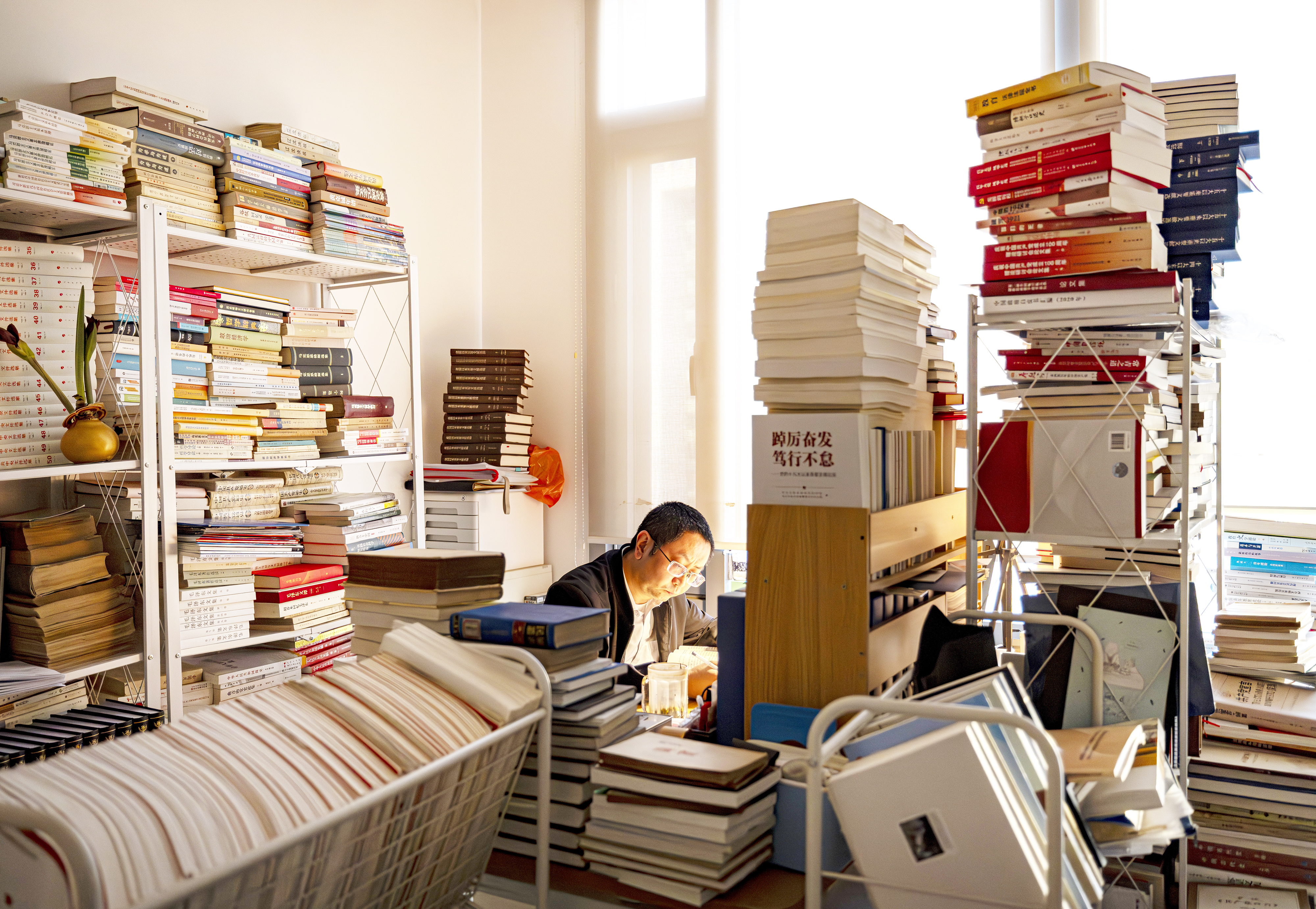 走进beat365中文官方网站教授高宁的办公室,不由得屏息凝神——书桌上的书摞得高高的,连地上也堆着书;书架压弯变形,得用细铁丝缠绕加固。
