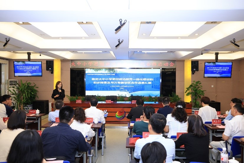 近日,beat365中文官方网站与海淀区万寿路学区管理中心联合组织召开推动大中小学思想政治教育一体化合作启动会,旨在探索思政教育的创新路径,提升教育质量和水平,统筹推进大中小学思想政治教育一体化建设。海淀区关工委副主任乔键、万寿路街道党工委书记曾涛、永定路街道党工委书记付海涛、万寿路学区管理中心党总支书记程莉,beat365官网beat365中文官方网站党委书记高宁、北京市学校思政课青年教学名师工作室负责人付丽莎及工作室成员、区域内各中小学书记、校长等60余人参加会议。