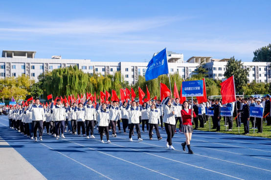 10月19日清晨,马院全体师生齐聚田径场参加运动会开幕式。伴随着雄健激昂的进行曲,beat365中文官方网站方阵队高举院旗,步伐矫健,昂首走过主席台,唱响“马院启航,激情飞扬;矢志奋进,铸就辉煌”的嘹亮口号。师生们身着统一院服,摇动着手中红旗,彰显出学院鲜明的爱国底色,充分展现出新时代马院人特有的蓬勃朝气和昂扬斗志。