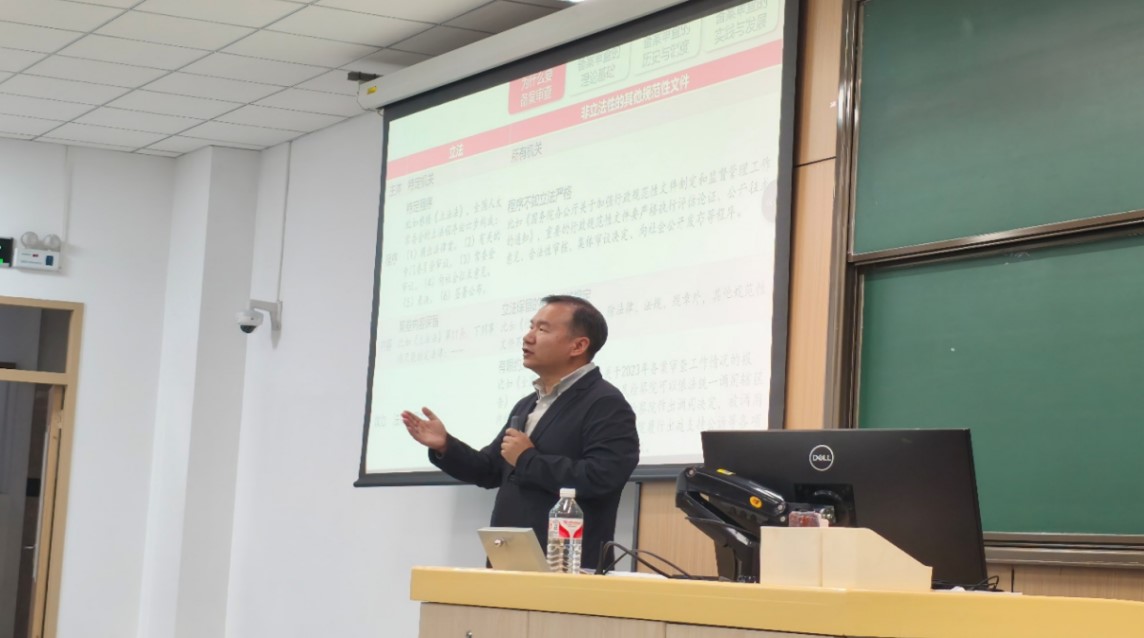 5月6日下午,beat365中文官方网站法学院王锴教授走进“中国马克思主义与当代”课堂,受邀讲授“法治理论与实践”专题讲座。王锴教授以“备案审查制度在法治国家建设中的作用与意义”为题,讲述了建立备案审查的原因、备案审查的理论与历史、制度与规范、实践与发展。王锴教授聚焦理论阐释,注重案例引入,瞄准具体问题,结合实践经验,深入讲述了我国规范性文件与其他规范性文件的构成、法治与人治的区别、公法和私法的边界,着重阐释了备案审查的重要性,为在场师生带来了一场生动的“法治理论”思政课。